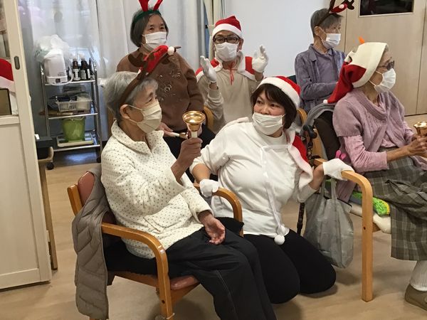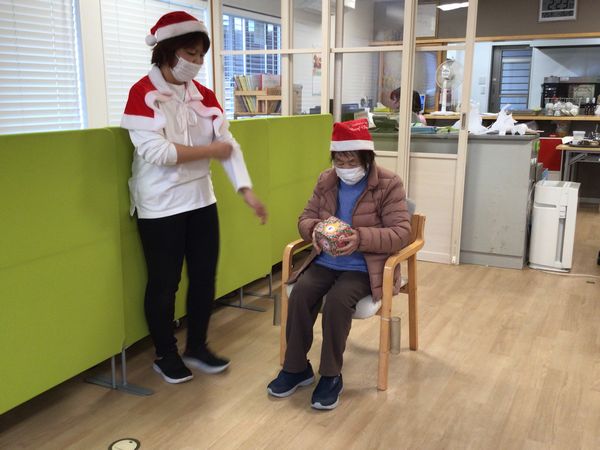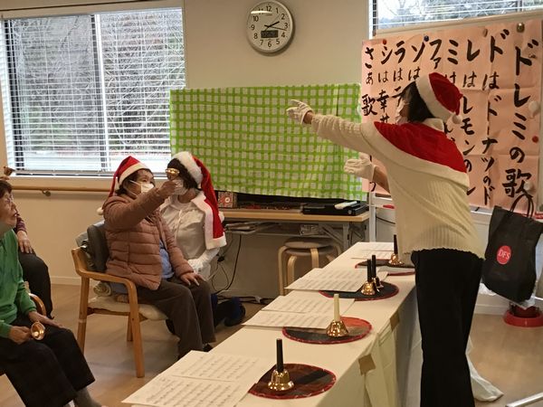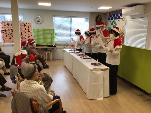 職員と一緒にハンドベルを演奏し、きれいな音色がフロアいっぱいに響き渡りました。初めての方も笑顔で参加され、息の合った演奏となりました。その後は、みんなで楽しめるゲームで大盛り上がり。笑い声があふれ、会場は終始あたたかな雰囲気に包まれていました。そして…サンタさんが登場! 一人ひとりにプレゼントが手渡されると、驚きと喜びの笑顔がたくさん見られました。笑顔あふれる、心温まるひとときとなりました。